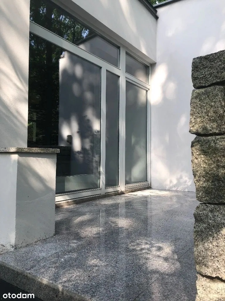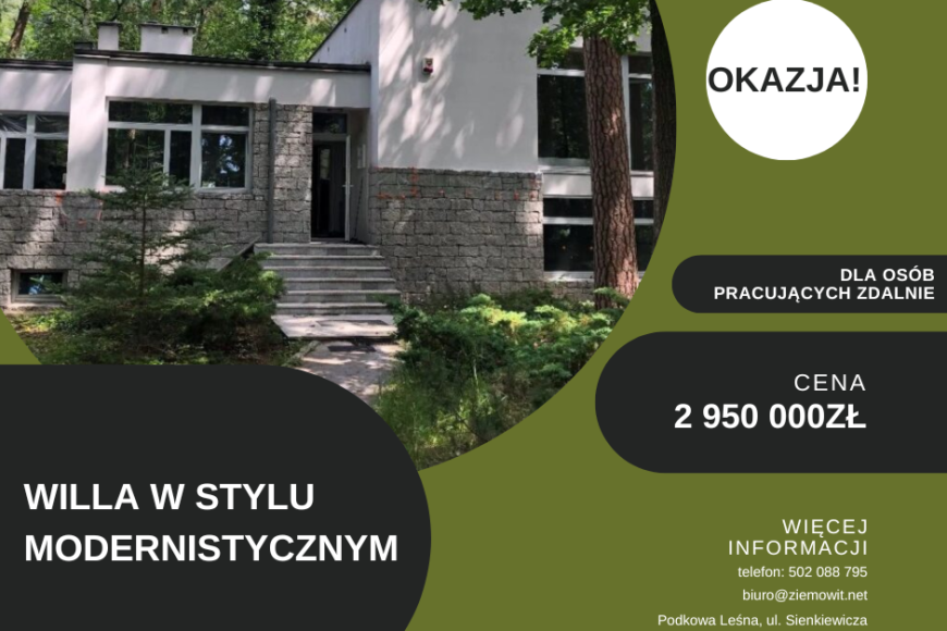Willa w stylu modernistycznym (kubizm) zlokalizowana przy kameralnej ulicy Sienkiewicza – to asfaltowa ulica z szerokim 6 metrowym poboczem porośniętym głogami, jaśminami i brzozami wychodząca na wprost Lasu Młochowskiego. 5 minut spacerem do stacji WKD Podkowa Leśna Głowna. 300 metrów do szkoły podstawowej.
